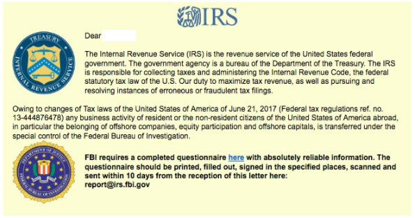 Beware of an email scam that purports to be a message from the IRS and/or the FBI about a new law on tax compliance. There is a link in this email to a “questionnaire” that, once clicked by the victim, enables the scammer to seize control of their computer. If you do have a personal tax issue, the IRS will contact you by U.S. mail. This scam email may look like this, according to AARP: